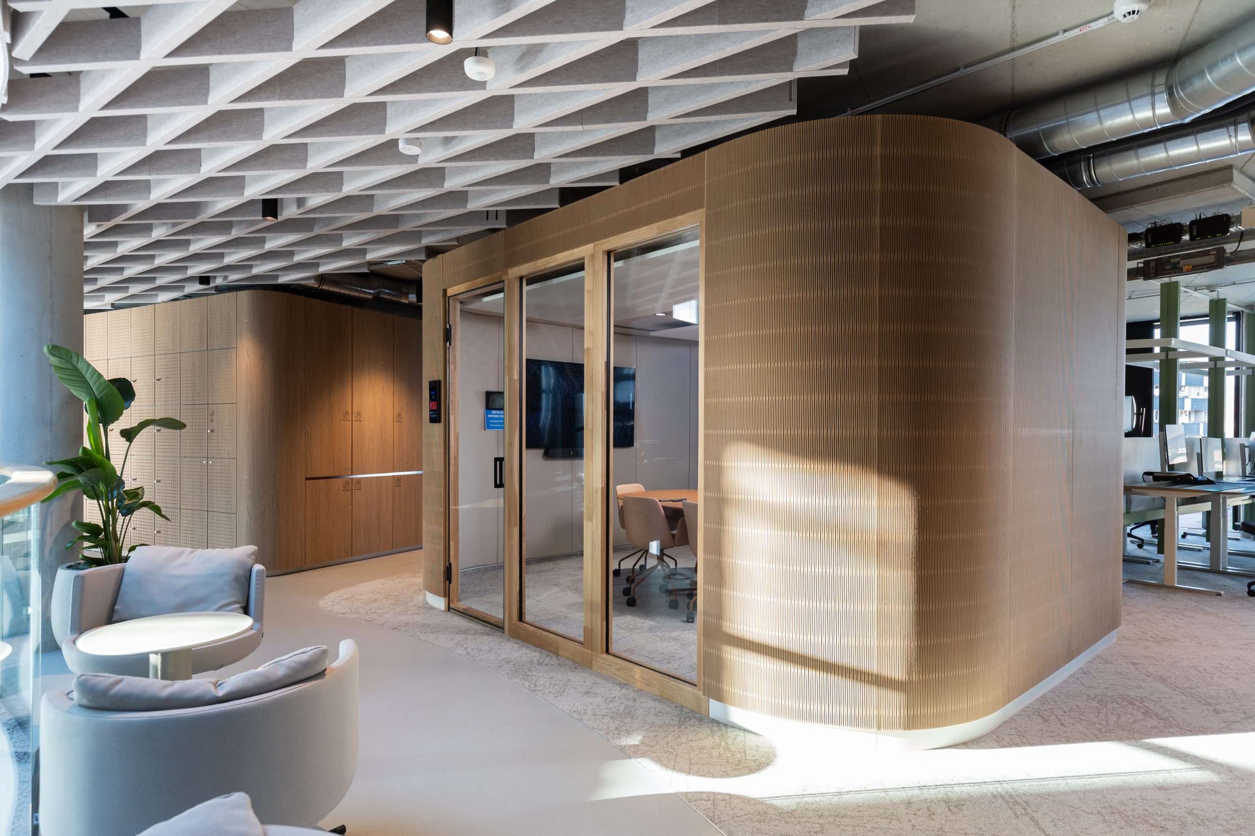 Pri návrhu priestoru sme kládli dôraz na použitie ekologických materiálov a produktov s nízkou emisiou škodlivín, vo farbách, štruktúrach a vzoroch inšpirovaných biofilickým dizajnom. Zamestnanci tak pracujú v zdravom prostredí, s prirodzeným vetraním cez pomalé zaplavovanie priestoru čerstvým vzduchom z podlahy a chladením cez aktívne betónové jadro. Osvetlenie je nastavené na 70 % nepriameho svetla do stropu a 30 % na pracovnú plochu, čo podporuje správny cirkadiánny rytmus.